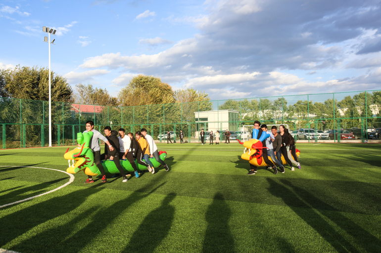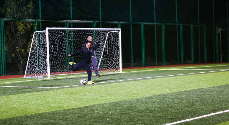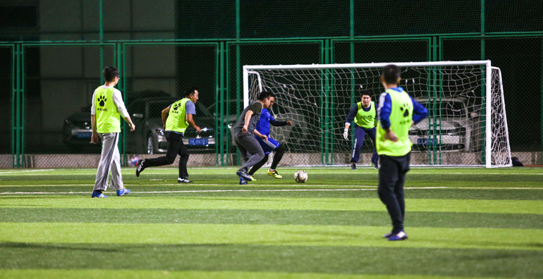 足球比賽是本屆運動(dòng)會(huì )呼聲最高的一個(gè)項目。在群眾的強烈要求下,原定的“五人足球”演變成了“九人足球”。隊員們在球場(chǎng)上都全力以赴,以致于第二天大家可以輕易地以走路姿勢來(lái)判斷誰(shuí)參加足球賽了(腿疼……)