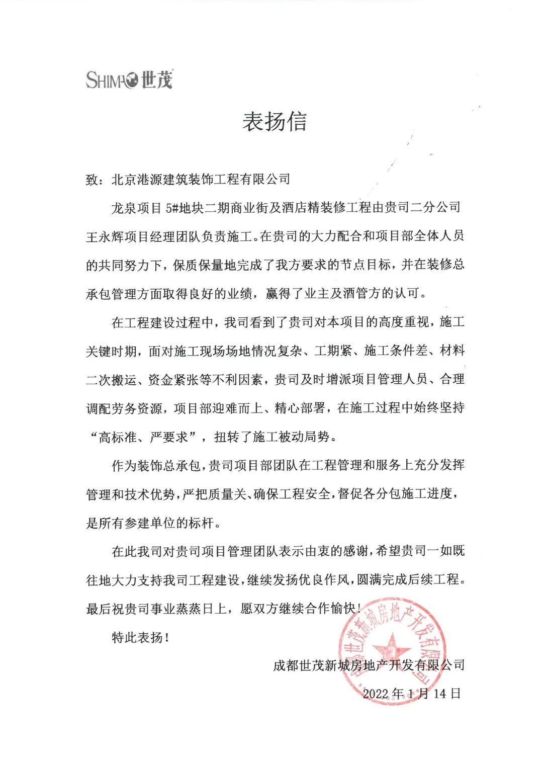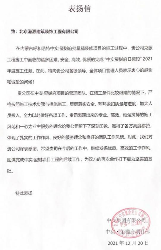 一封封表?yè)P信、感謝信,是對港源品牌的認可,也是對全體項目管理人員付出的肯定,更是鞭策我們不斷提高服務(wù)質(zhì)量的動(dòng)力。在今后的施工管理服務(wù)中,北京港源將堅持以“讓客戶(hù)更滿(mǎn)意”為宗旨,以適應客戶(hù)的多樣化需求。